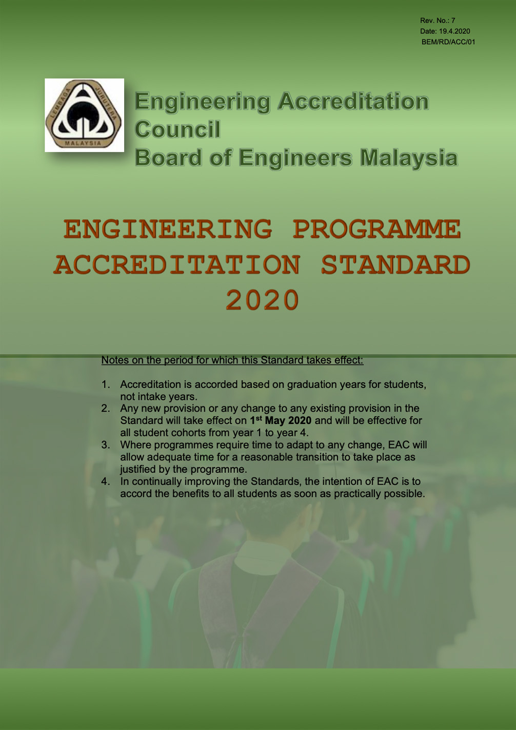In Malaysia, all engineering programme must be accredited by the Board of Engineers Malaysia (BEM) through its accreditation body, the Engineering Accreditation Council (EAC). The EAC ensures that engineering education meets international standards, promoting quality and professionalism in the field. Universities offering engineering degrees must undergo regular evaluations and audits to maintain accreditation, ensuring their programme produce qualified engineers who meet industry and regulatory requirements.
